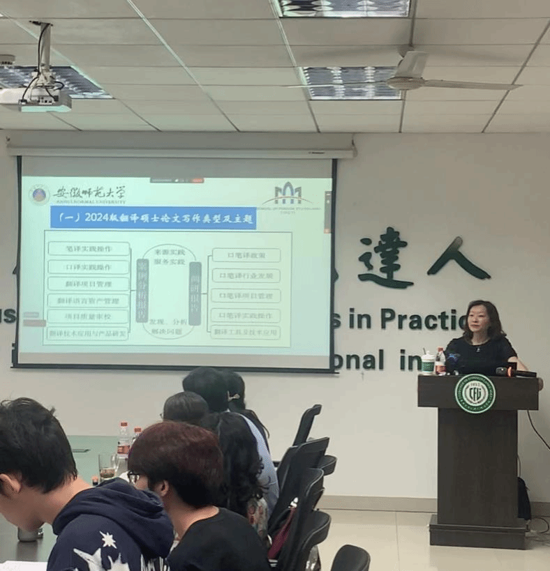 2025年5月30日下午,安徽师范大学英国365集团副院长、MTI硕点负责人蔡静教授应邀做客我校“狮子山导师学校”,在人文楼附楼A102会议室为英国365集团师生带来了一场精准指导MTI学位论文写作的专题辅导讲座。本次讲座由耿云冬副院长主持。