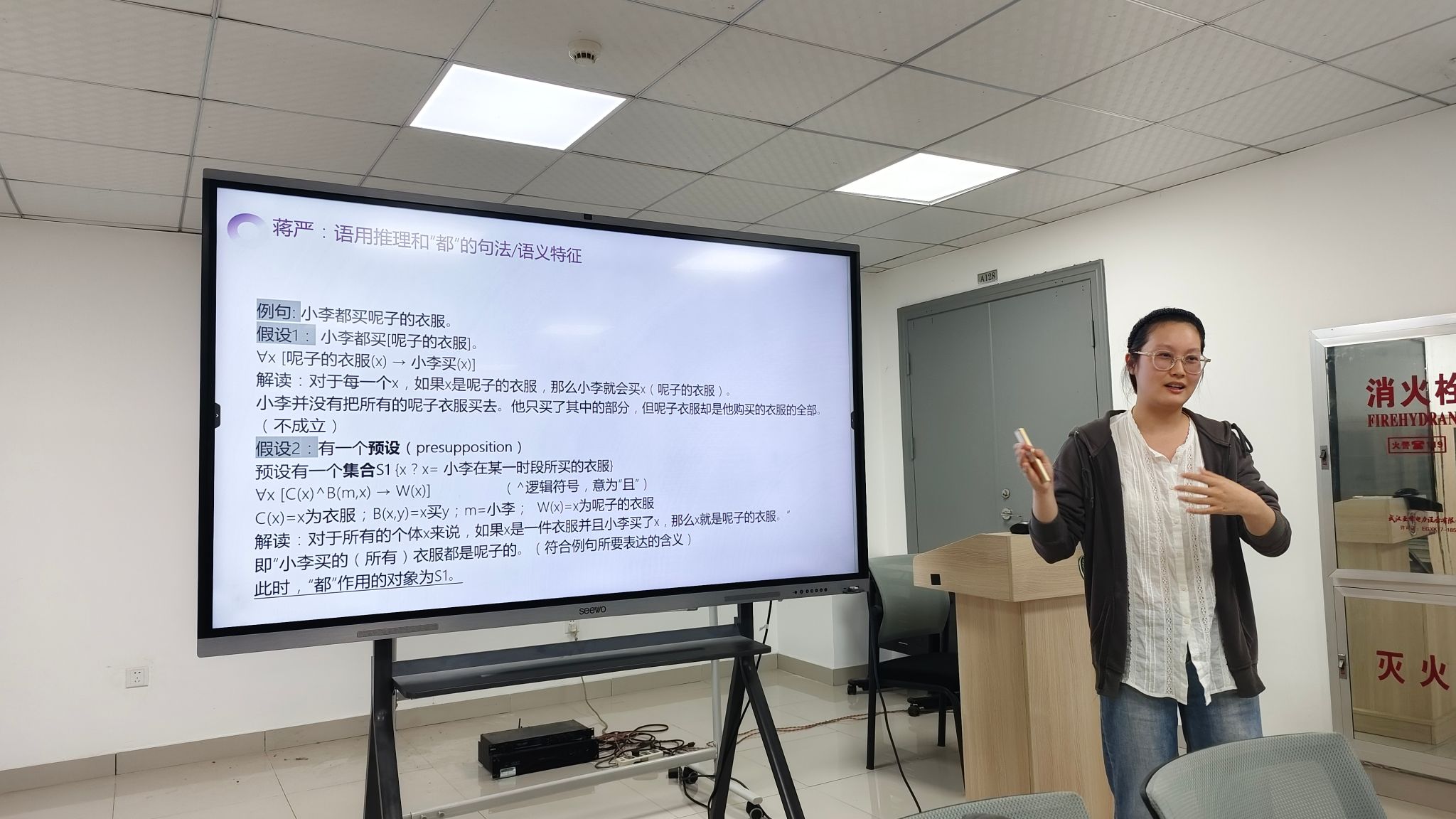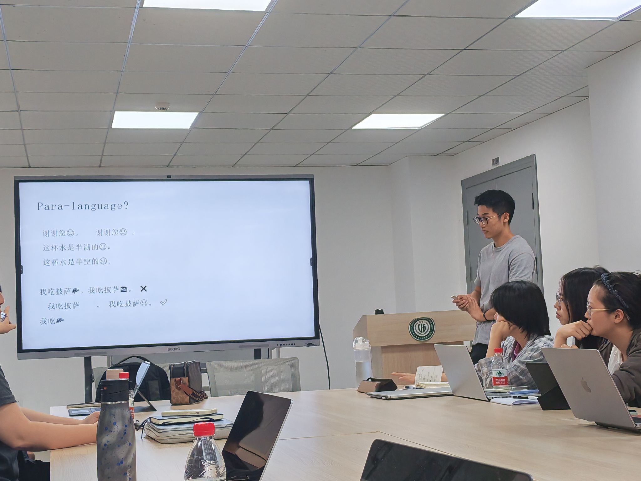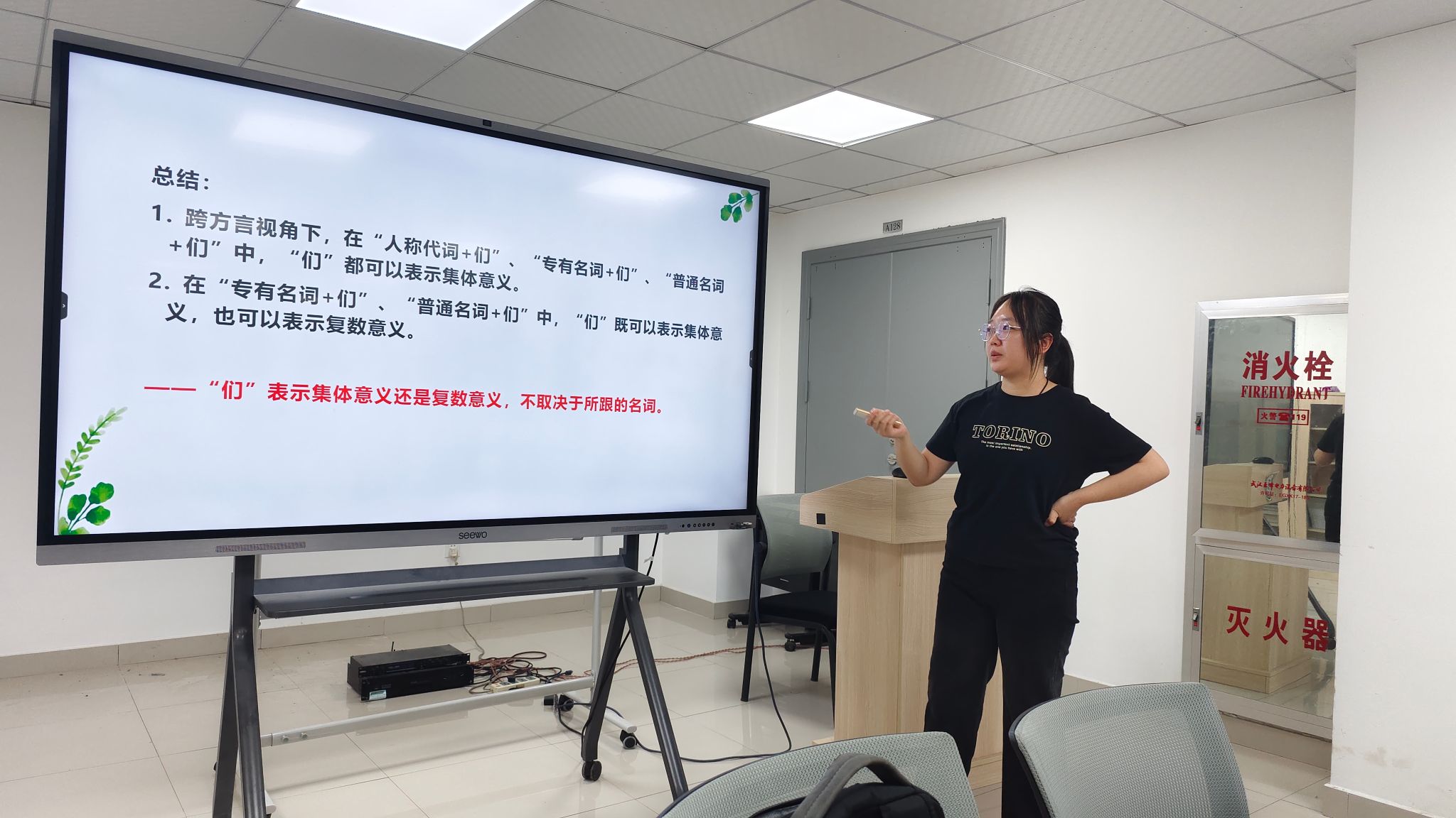 在上半场的主题分享环节,师生围绕跨语言对比、网络语言现象、方言研究等议题展开学习和讨论。我院研究生黄沁源同学以汉语与日语“家族”同形词为研究对象,系统阐述了同形语界定标准与对比研究方法,为跨语言语义分析提供了新思路;我院本科生孙勃林则聚焦emoji语言属性研究,通过语法与语义层面的对比分析,探讨了符号意义的生成与传递机制,引发在场师生对“非传统语言现象”的热烈讨论。