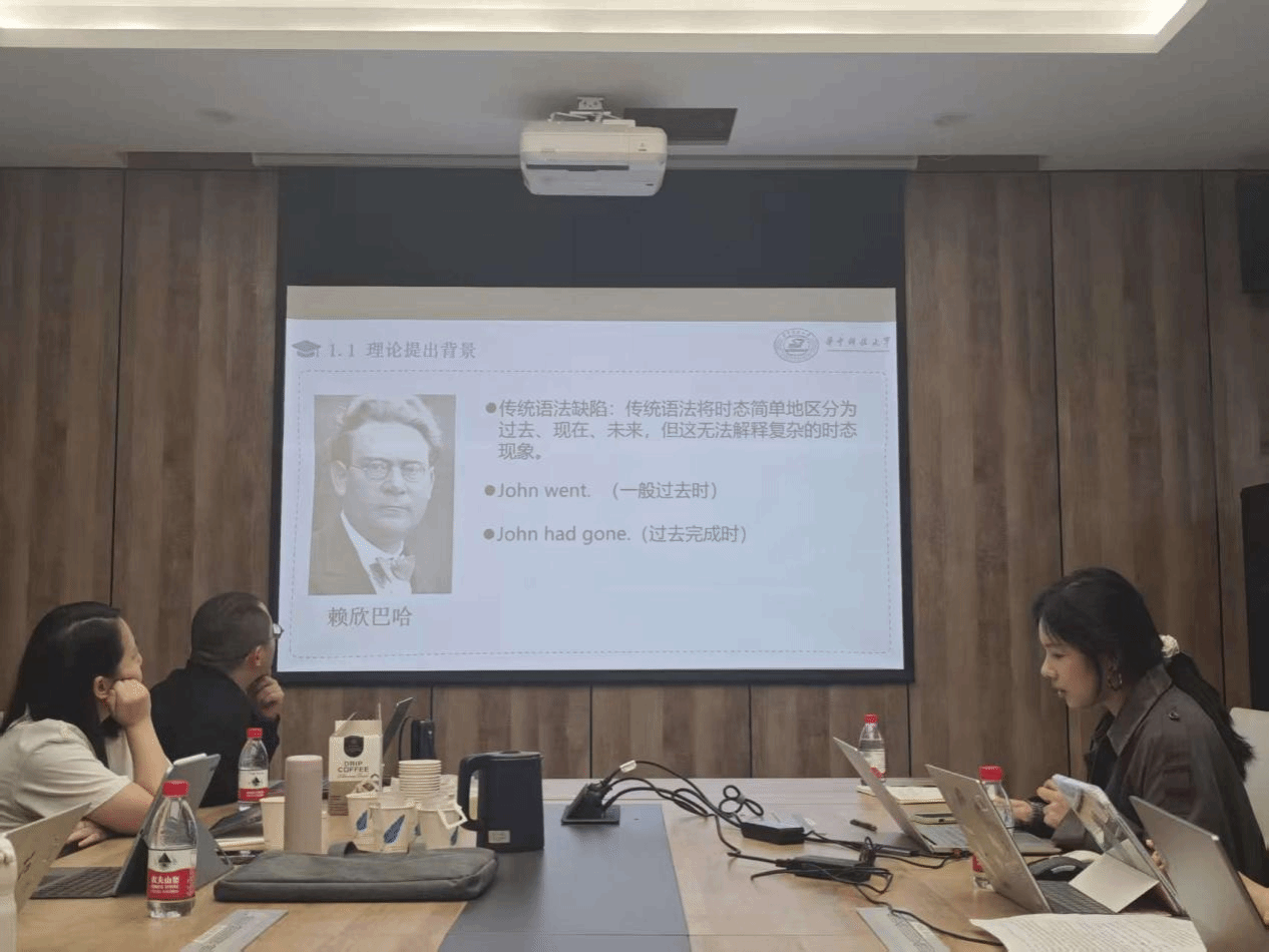 在第一部分,华中科技大学人文学院研究生王昊、李景珊两位同学围绕Verbs and Times(Vendler 1957)系统汇报了动词分类与时体范畴的经典理论。徐贝贝指出,汉语是否存在“时”“体”范畴在学界尚无定论,引入西方理论须注意与汉语事实相结合,构建本土化语言学话语体系;赵琛补充介绍了该文的后续发展与“内在体”的相关研究;刘星则结合家乡方言中“去哩”的用法,增强了理论的实证联系。徐毅发鼓励同学们通过具体例句检验理论,推动理论在汉语中的微观应用。