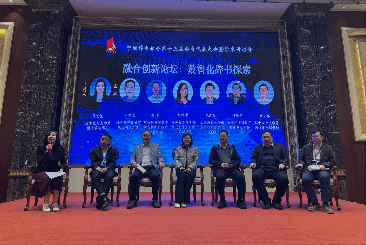 本届大会“融合创新论坛”的主题为“数智化辞书探索”,由南方医科大学教师蒋文凭主持。论坛期间,耿云冬与来自科大讯飞的副总裁汪张龙、中国知网数据中心的总经理谢磊、网易有道北京公司的副总裁何皓瑜、上海海笛公司的CEO范剑淼、商务印书馆万有知典公司的总经理孙述学等业界代表展开跨界对话。