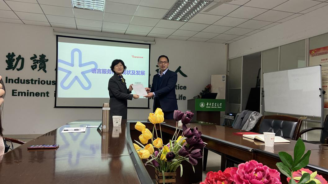 讲座开始前,覃江华副院长代表学院对闫栗丽副总裁的到来表示热烈欢迎,并向其颁发了翻译硕士专业学位行业导师聘书。