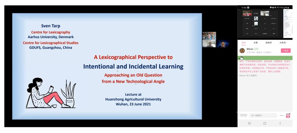 6月23日下午,丹麦奥胡斯大学词典学中心主任Sven Tarp教授应邀做客第148期外语论坛·专家论道,为我院师生和国内学界词典学人做了题为“A Lexicographical Perspective to Intentional and Incidental Learning: Approaching an Old Question from a New Technological Angle”的线上讲座。该讲座由我院语言学跨学科研究中心、外语教育研究所以及国别与区域暨世界农业文化研究中心联合举办。覃江华副院长代表学院致欢迎辞。Zoom平台和哔哩哔哩直播平台逾1400人参与了本次讲座。