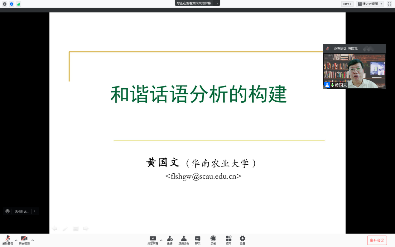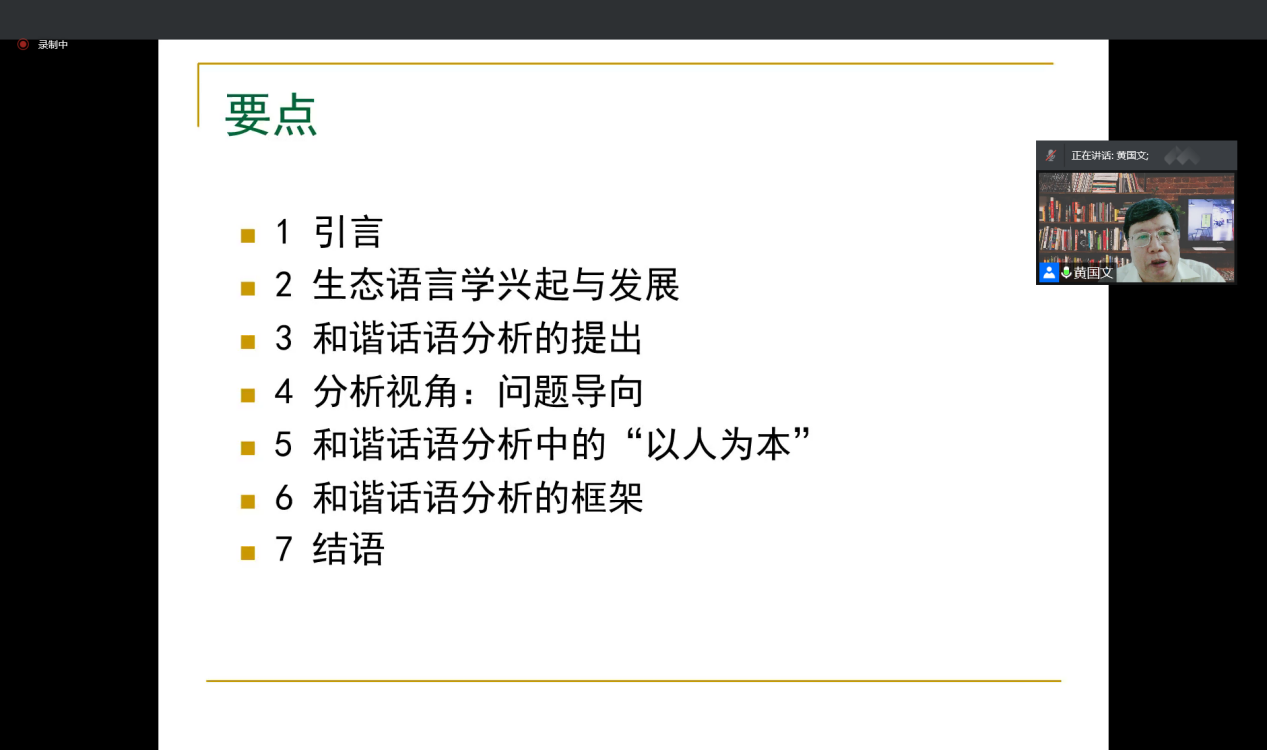 12月8日晚,应我院邀请,教育部国家级人才特聘教授、华南农业大学英国365集团黄国文院长作客外语论坛,通过腾讯会议平台以“和谐话语分析的构建”为题做专题讲座。讲座受到我院师生和全国各地学者的广泛关注。副院长覃江华代表学院致欢迎辞,卢健老师主持讲座。