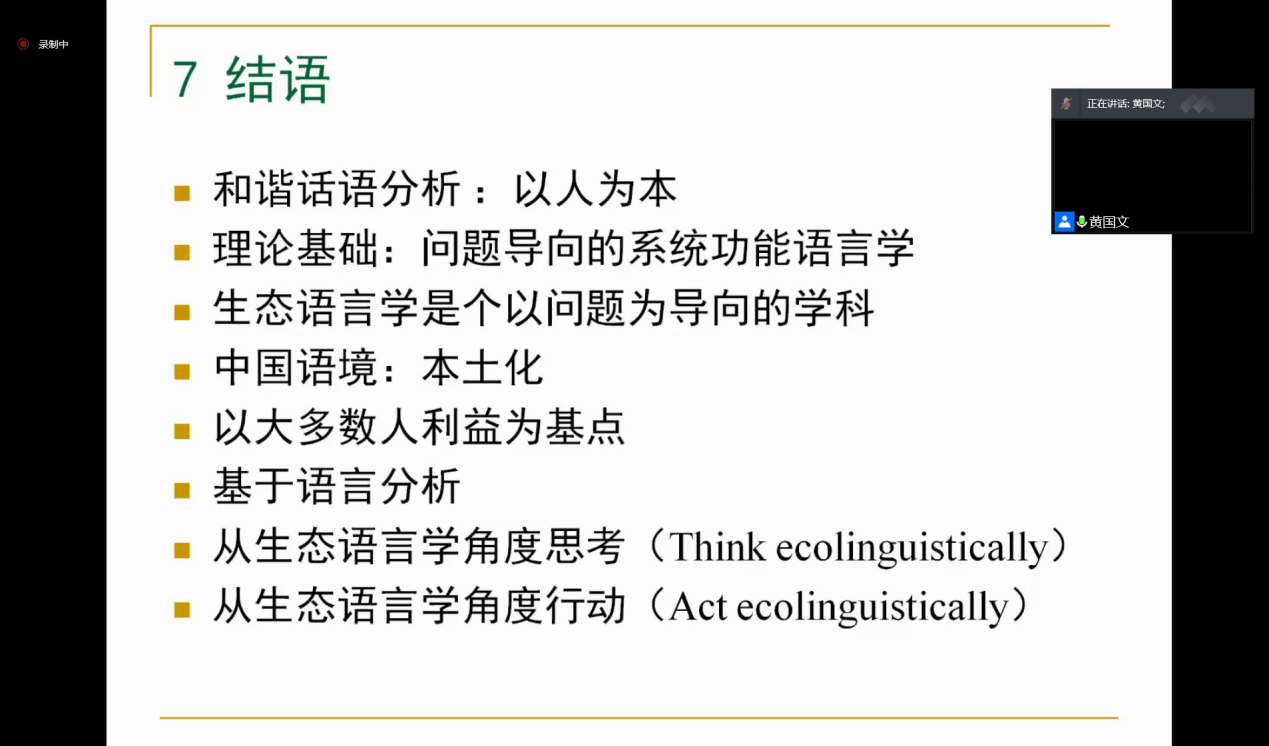 讲座结尾,黄老师做了简要总结,并回答了听众有关生态语言学与课程思政的问题。黄老师的讲座用例精彩,信手拈来之际恰如妙手偶得;论述精妙,鞭辟入里而令人信服;表述精当,深入浅出而使人醍醐灌顶。大家均表示,听君一席话,胜读十年书,获益匪浅。