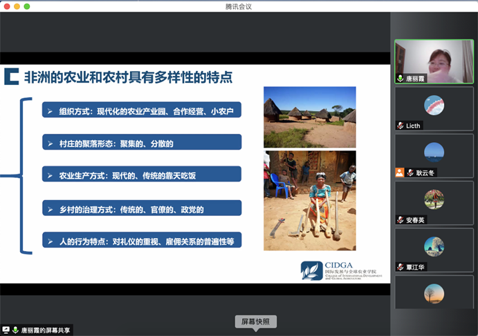 12月18日晚,中国农业大学人文与发展学院发展管理系唐丽霞教授应邀做客第162期外语论坛·专家论道,做了题为“走进非洲的农业和农村”的线上讲座。本次讲座由我院国别与区域暨世界农业文化研究中心和武汉大学非洲研究中心联合举办。讲座由我院特聘教授王战主持,学院副院长覃江华代表学院致欢迎辞。