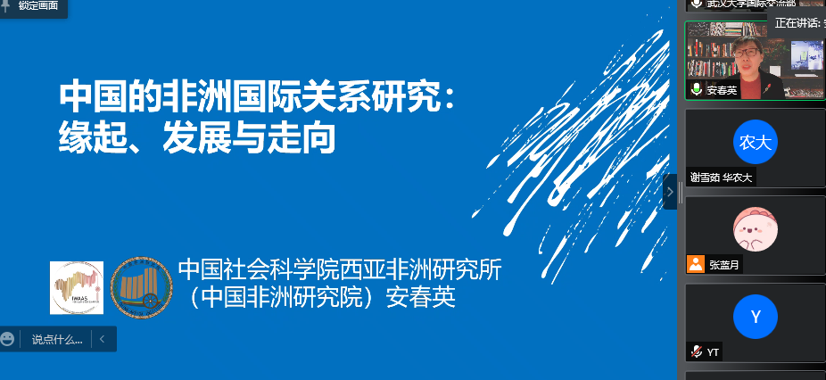 12月23日下午,中国社会科学院西亚非洲研究所(中国非洲研究院)《西亚非洲》常务副主编、编审安春英老师做客我院163期外语论坛·专家讲道,通过腾讯会议平台做了题为“中国的非洲国际关系研究:缘起、发展和走向”的讲座。本次讲座由我院国别与区域暨世界农业文化研究中心和武汉大学非洲研究中心联合举办,王战教授主持。