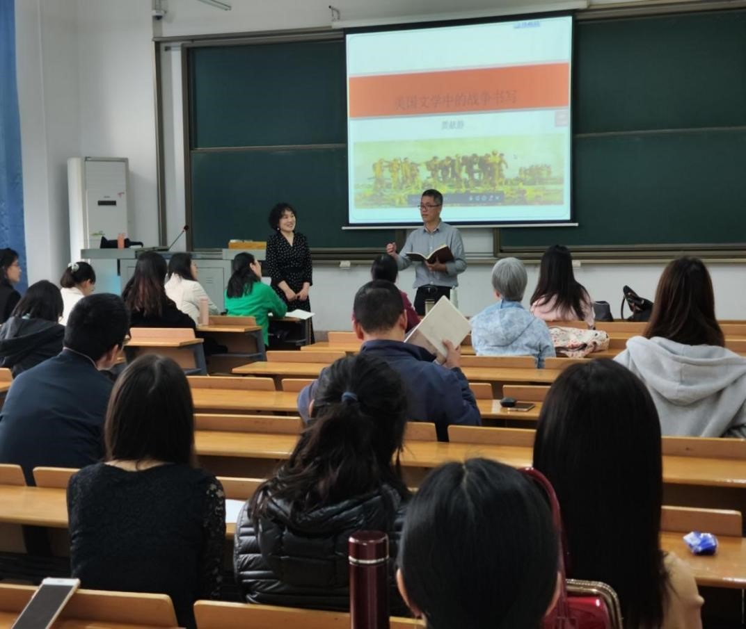 2022年4月29日下午,我院 “外语论坛·文学讲堂”第5期开讲,龚献静教授应邀做题为“美国文学中的战争书写”的专题讲座。讲座由文学跨学科研究中心主任李敏锐副教授主持,学院部分教师、研究生和本科生参加。