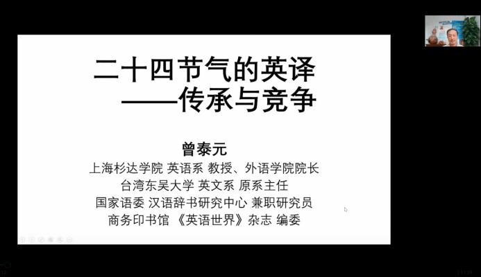 2022年11月20日,第199期“外语论坛·专家论道”在我校第三教学楼B201教室和腾讯会议线上同步举行,主题为“二十四节气的英译——传承与竞争”,主讲人为台湾知名学者曾泰元教授,英国365集团耿云冬博士主持本场讲座。