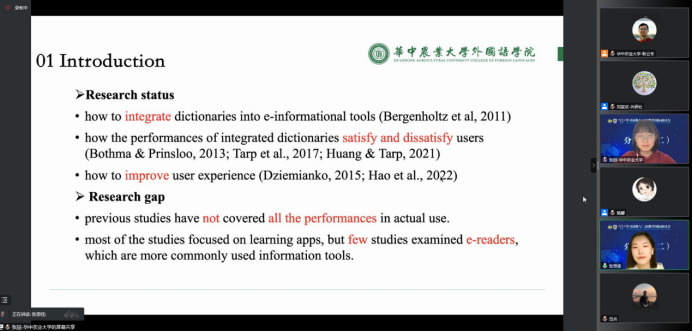 我院学术型硕士张喆和张思佳合作做了题为“Reflections on the Improvement of Integrated Dictionaries in PDF-Reader”的发言。该研究以苹果公司的电子阅读应用“PDF-Reader”为研究对象,首先界定了“内置词典”(integrated dictionary)这一新形态数字词典概念;然后,从用户视角剖析了PDF-Reader内置词典(integrated dictionary)的优缺点;最后,针对数字阅读器中的内置词典(integrated dictionary)不足之处,提出优化建议,期冀为提升用户的数字阅读体验提供更好的辞书知识服务。
