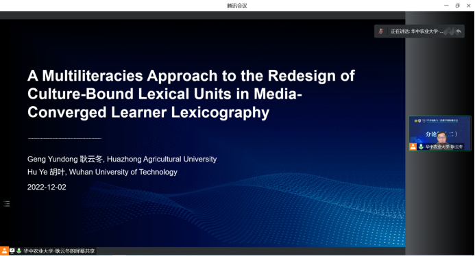 作为联席主持人,我院耿云冬副教授担任分论坛二“融媒体背景下双语词典与二语教学”主持任务,并做了题为“A Multiliteracies Approach to the Redesign of Culture-Bound Lexical Units in Media-Converged Learner Lexicography”的专题发言(合作者:胡叶)。该研究首先界定了相关核心术语概念:多元识读(multiliteracies)、文化负载词(culture-bound lexical units)、融媒辞书(media-converged learner lexicography);然后,以“茶(tea)”条目为个案,剖析了现有纸本词典、在线词典以及词典APP中文化负载词条目设计存在的问题;接下来,从助益词典用户多元识读能力发展的角度,提出tea条目的融媒设计优化路径:在知识组织层面要借助跨学科思维,在知识呈现方面要注重交互性、多模态性等,在知识传播方面要服务数字化社交生活等;最后,该研究指出,文化负载词的融媒设计是践行融媒辞书理念的最佳场域之一,有助于推进双语词典在不同文化对话、维护世界语言文化多样性方面的桥梁功用。