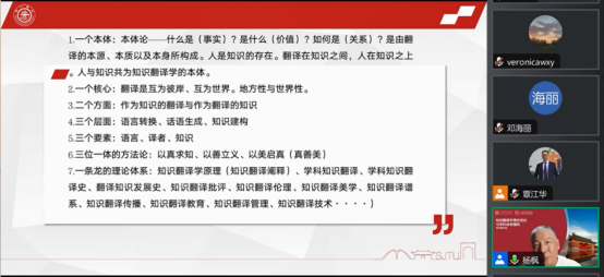 杨枫教授是知识翻译学的首倡者,由他主讲的本场讲座揭开了“知识翻译学专业委员会系列学术活动”的大幕。其成功举办为接下来的系列学术活动和10月27至29日在上海召开的“中外语言文化比较学会知识翻译学专业委员会成立大会暨首届知识翻译学学术年会”吹响了号角。知识翻译学作为新兴的本土理论,在过去两年里引起了翻译学界学者们的热议,也即将步入新的发展阶段。期待未来有更多学者加入知识翻译学的学科体系建构,创造更多理论研究与实践成果。