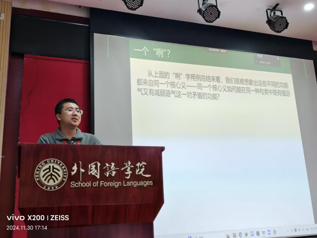 11月30日下午,我院教师徐贝贝与广东外语外贸大学陈哲教授合作做了题为“武汉方言多功能句末助词‘咧’的初步考察”的报告。报告尝试运用形式语言学的工具,从句法、语义和语用三方面对武汉方言中“咧”的多功能性进行深入的描写与分析,以期找到这些多样用法背后的各自特征。徐贝贝的报告受到与会专家一致好评。清华大学刘明明副教授等与会专家从选项语义学视角对报告中的一些分析提出了建议。
