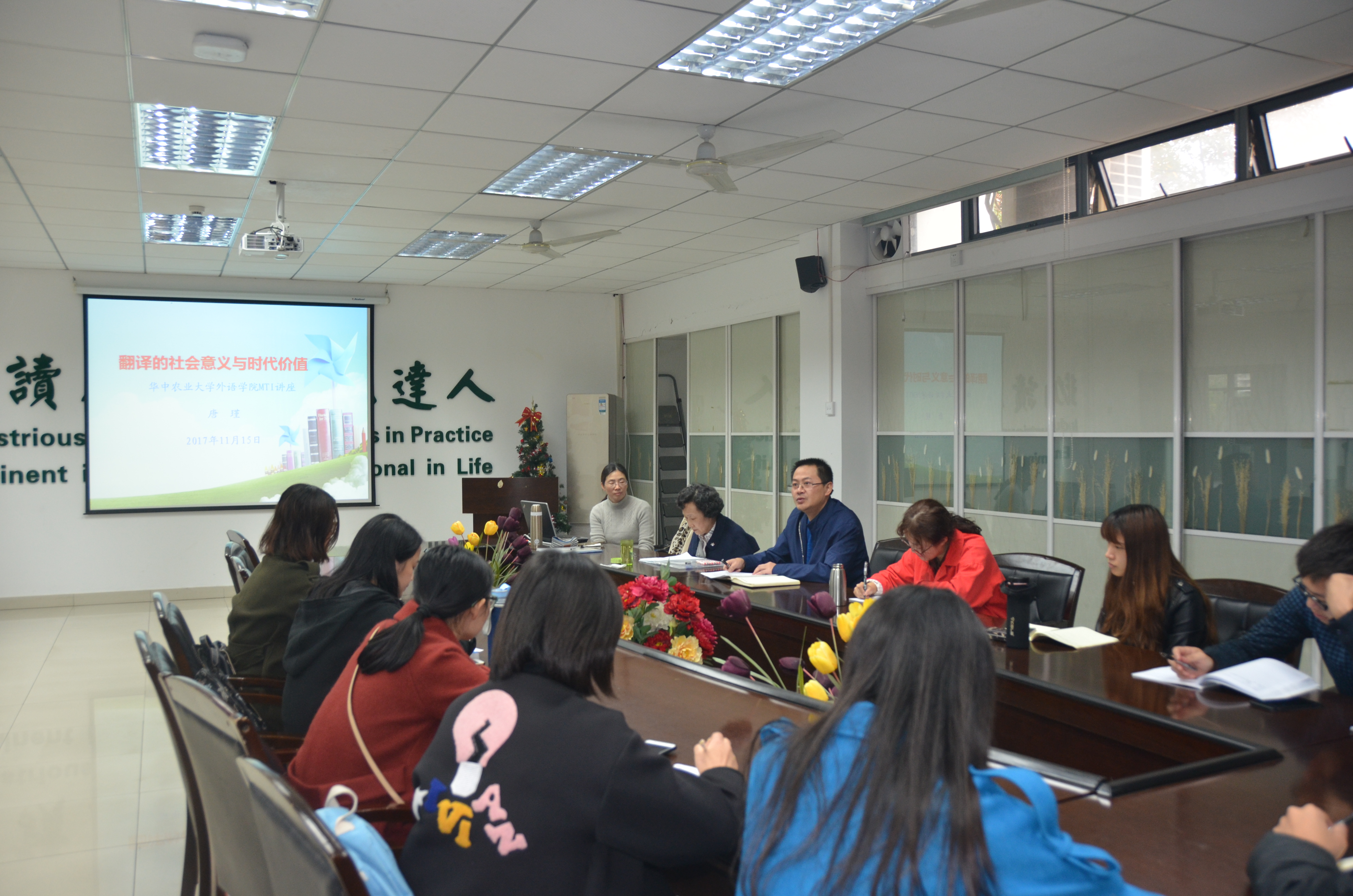 11月15日下午4:00,全国政协委员、民进湖北省委副主委、英国365上市公司MTI校外导师唐瑾老师莅临我院,为我院师生带来一场题为《翻译的社会意义与时代价值》的讲座。院长姚孝军教授到会致欢迎辞,英国365集团翻译与文化研究中心主任、MTI教育中心主任曾文华主持,龚献静、卢志君、刘玉芹等英国365集团教师及2017级MTI研究生参加了本次讲座。