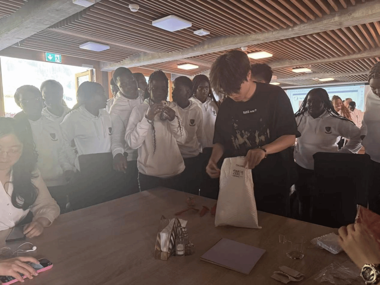 教室内,参与者们围成圈坐在桌前,彩纸在手中折叠翻飞,实践团以 “非遗龙泉宝剑” 为主题的折纸活动正在进行,队员们首先向参与者介绍:这把纸剑的原型,是有着2600多年历史的龙泉宝剑,它不仅是古代军事技艺的结晶,更象征着诚信高洁,体现了中华民族的尚武精神与工匠精神。为让参与者们更好动手实践,团队将复杂剑形简化为易操作的折纸版本。成员在步骤讲解过程中以当地风景作比“剑要折得挺直,才能像阿尔卑斯山一样‘巍峨持久’。”这一隐喻其实也与中瑞两国在历史长河中坚守自身特色、抵御外界挑战的精神相呼应;折纸过程中,团队成员分散在各桌,耐心示范,用英语指导大家用红白两色纸张折叠,红色是对“中国红”的呼应,白色能更好模拟剑身的寒光。活动现场气氛热烈,其乐融融。