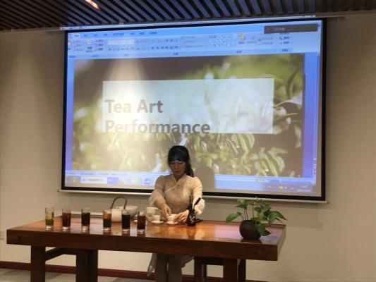 在对中国茶文化进行了初步了解后,由茶学研究生赵潇懿和茶学留学生Bernard分别进行了中国茶艺表演,他们的动作一致却又各具特色,赵潇懿的举止动静之间皆是古典之美,而Bernard的表演又颇具几分异域风味。吴嘉怡做了中英文双语讲解。