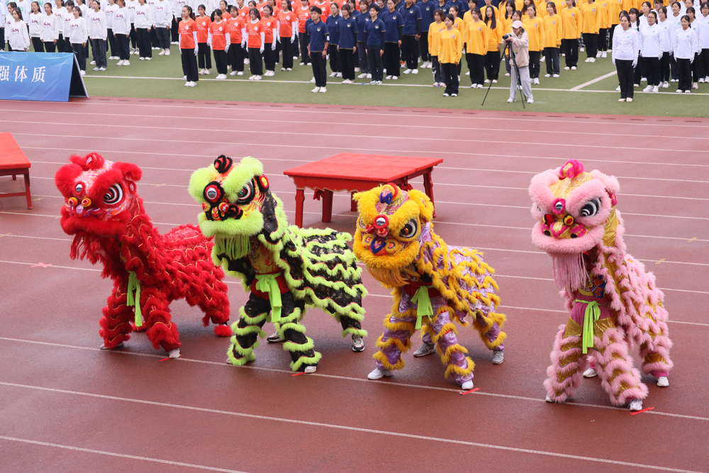 开幕式开始,校党委书记高翅、校长李召虎为醒狮点睛。点睛仪式寓意着吉祥、如意,在开幕式上点睛,也是祝愿运动员能够在赛场上如金狮一般,尽情绽放自己的活力。伴随阵阵锣鼓,栩栩如生的“狮子们”接续神气十足地出现在师生面前。跳跃,翻腾,狮头狮尾配合默契;后脚一蹬,前脚一提,腾挪间站在木凳上;后腿悬空着地,前腿腾挪自如,准备下台。霎那间,全场掌声雷鸣,喝彩一片。