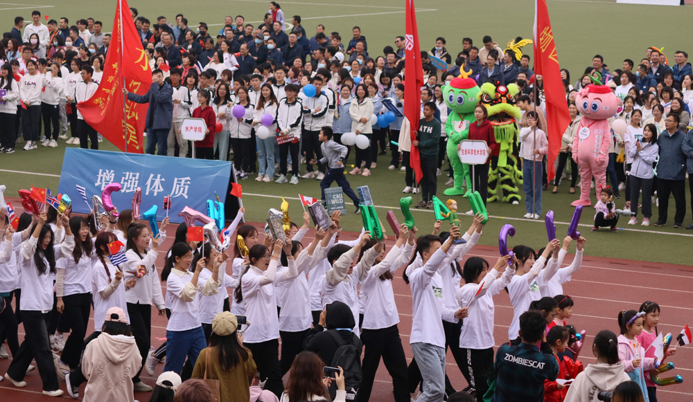 体操表演结束后,运动员、裁判员入场。伴随着欢快的乐声在会场飘扬,裁判员首先入场。接着,极具学院特色的各院方队依次入场,展现着各学院的独特风采。其中,我院方队高举院旗,礼仪队成员手持彩色字母,共同拼出“College of Foreign Languages”的缩写,口中高喊“文明其精神 野蛮其体魄 Strong body Strong mind”的口号,极具青春活力,彰显学院特色,展现出了外院学子与教师独有的精神面貌。