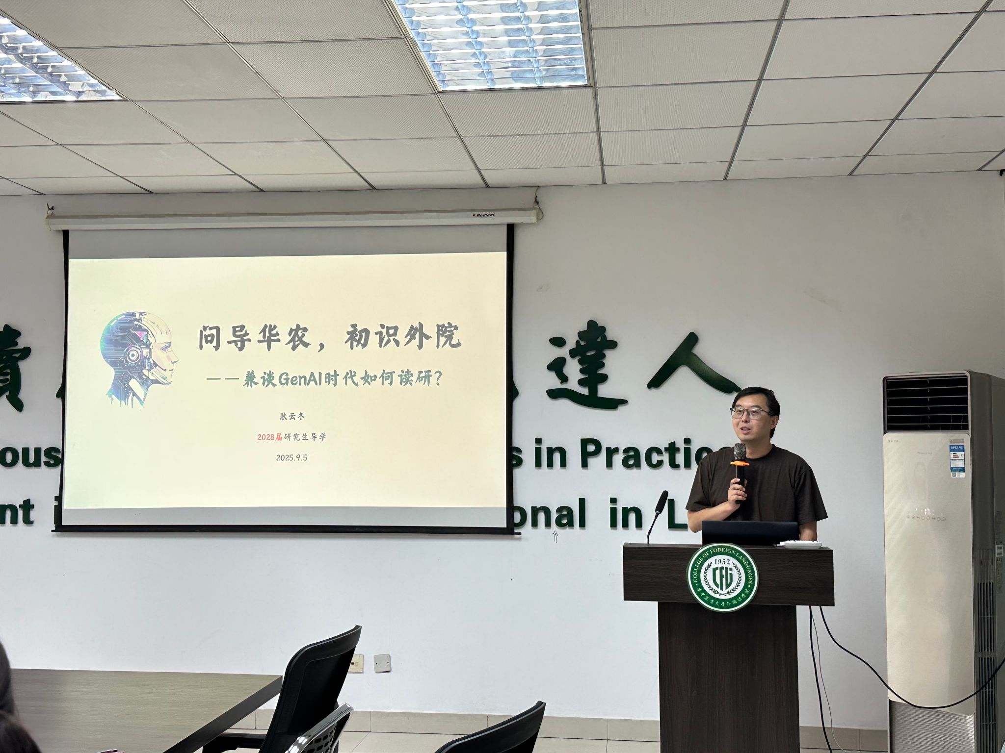 为帮助2025级研究生深入了解院史院情、更好规划学术生涯,我院于9月5日下午在人文楼附楼A102室举办题为“问导华农,初识外院”的入学教育活动,活动由辅导员袁梦瑶主持,耿云冬副院长主讲,全体研究生新生参与。