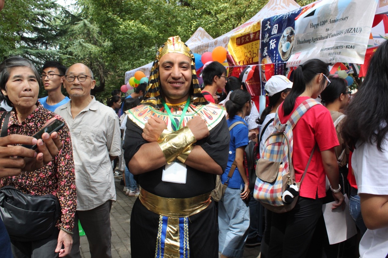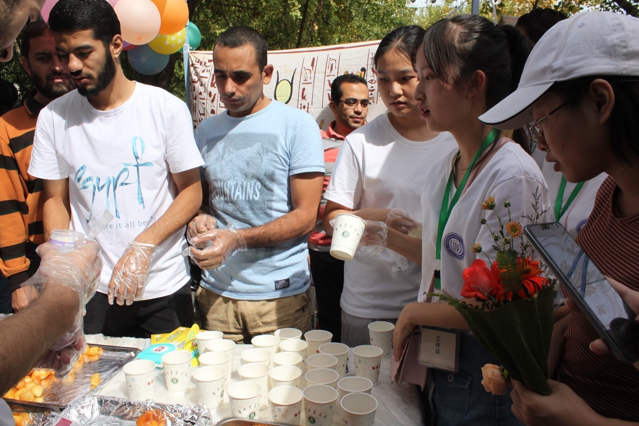 随后出场的埃及留学生,他们热情洋溢,展示了多种特色美食,如小吃、甜点和特色饮料,前来排队品尝的游客络绎不绝。在服饰文化展示环节,留学生有的身着法老装邀请校友们一起合影,有的展示着不同场合下的穿着打扮,展区周围人头攒动。