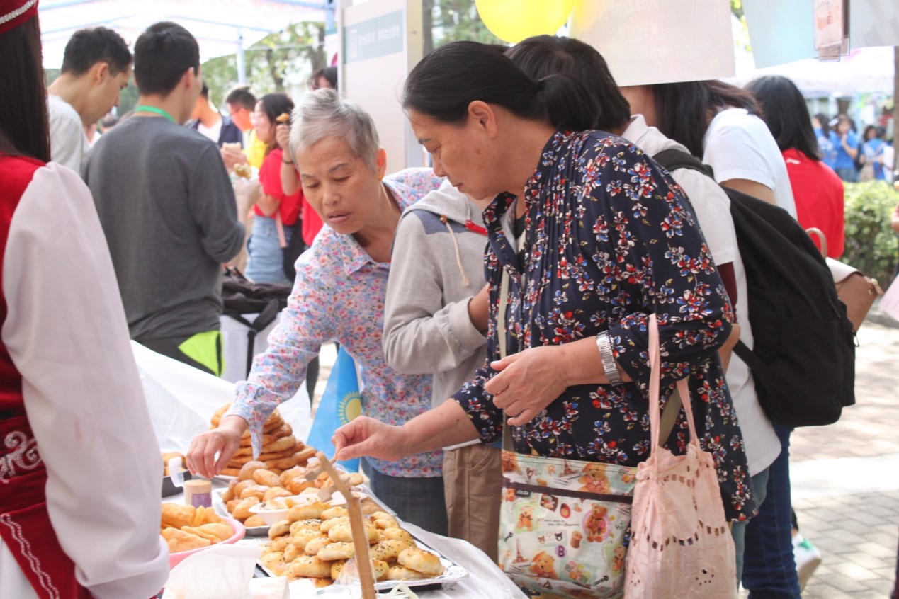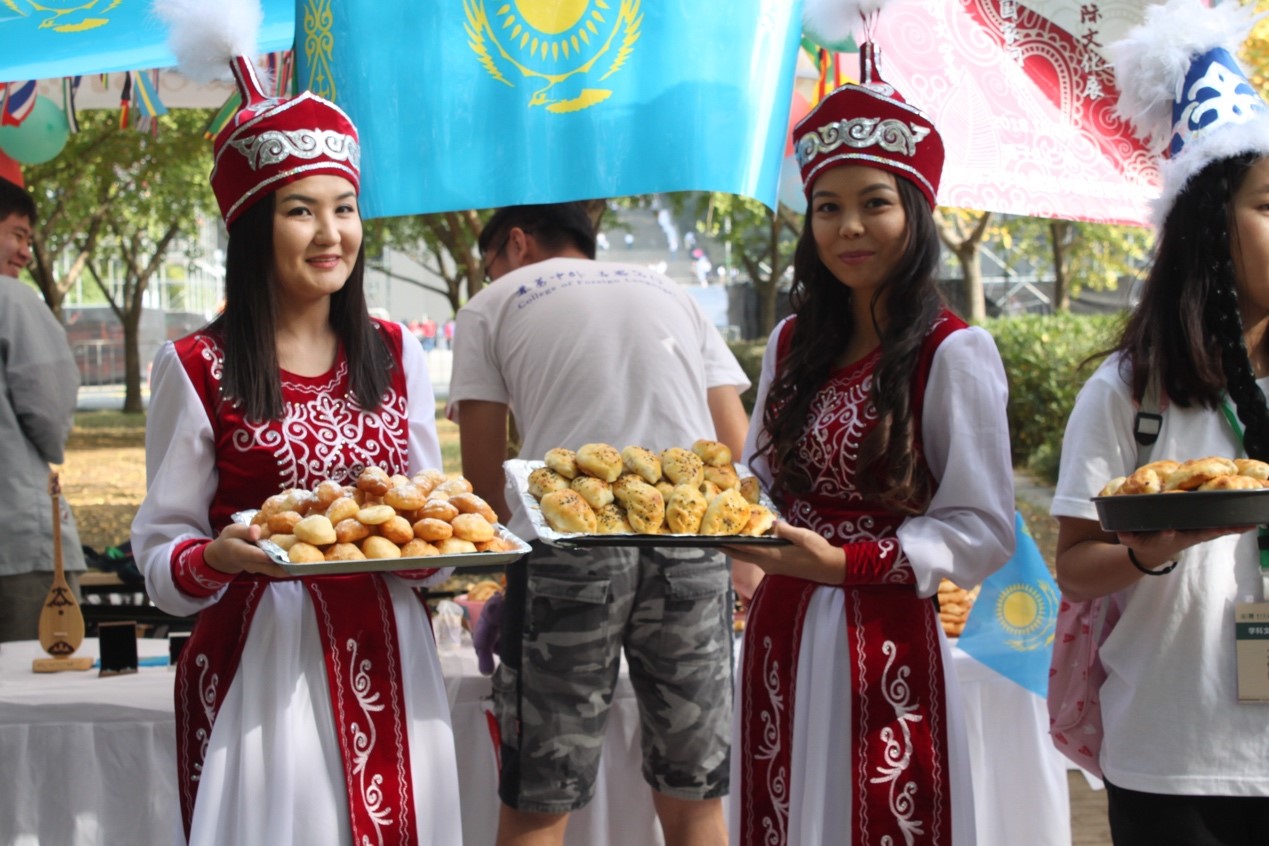 在国际文化展体验项目中,学院邀请在校留学生共同参与,为校友们带来一场充满异域风情的饮食、风俗文化体验盛宴。第一个展出的国家是哈萨克斯坦,两名身着民族服饰的留学生带来特色美食,并献上哈萨克斯坦的民族舞蹈。诱人的美食和曼妙的舞姿吸引了大批游客前来围观。