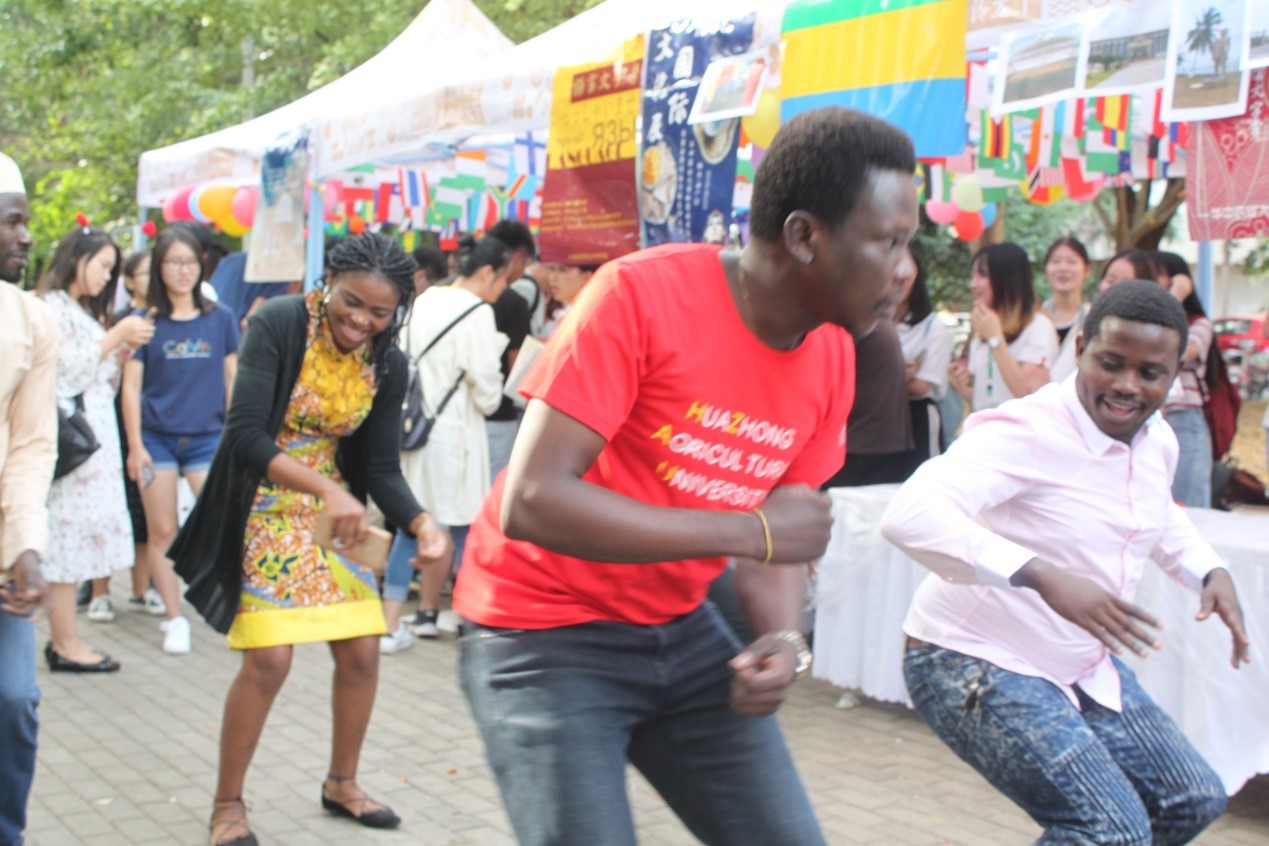 最后,来自加蓬的友人也开启了新一轮的舞蹈秀,一边给游客分发当地特色美食,一边带领他们跟随音乐舞动。