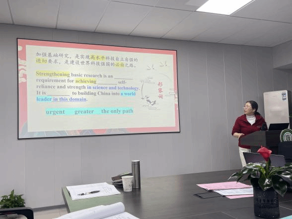 首先,曾文华创新采用《习近平谈治国理政》第五卷“一体推进教育科技人才事业发展”专题双语材料,带领全体党员开展沉浸式学习。通过“为党育人、为国育才”(cultivate talents for the CPC and the nation)等核心表述的精准对译,解析“高水平科技自立自强”(high-level self-reliance and strength in science and technology)、“教育强国”(education powerhouse)等关键概念的英文内涵。学习聚焦习近平总书记关于“加强基础研究”“激发人才创新活力”“以教育之强夯实国家富强之基”等五篇重要讲话,通过名词解析、动词凝练、形容词填空等互动环节,生动展现中国推进教育现代化、建设科技强国的战略擘画。这种“语言学习+理论武装”的模式,既提升了专业教师的政治理论素养,也为培养“会语言、通国家、精领域”的国际化人才提供了示范。值得一提的是,当天恰逢该同志的生日,与会党员以热烈掌声送上祝福,以这种特殊而有意义的方式共度了一个“党员学习生日”,充分体现了本支部党员学习的积极性和党组织的温暖关怀。
