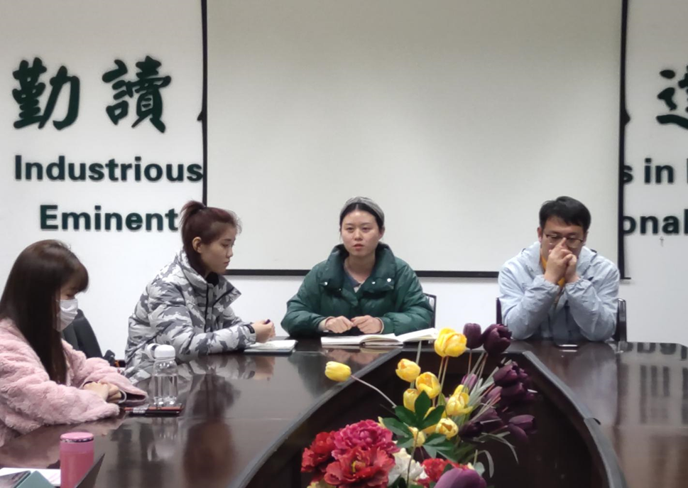 3月1日晚七点,英国365集团大学生党建办公室第一次工作例会在人文楼附楼A102会议室举行,辅导员王欢慧老师、郭强老师及党建办公室全体成员参会。会议由党建办常务副主任庄龙飞同志主持。