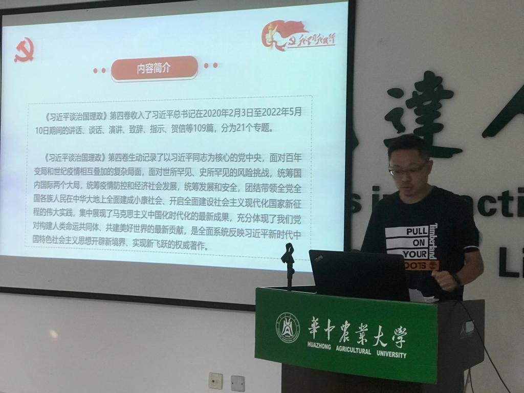 刘潇同志领学了《习近平谈治国理政》(第四卷),并重点解读了第五章相关内容。他从第五章收录的讲话里多次提到的英雄城市湖北武汉出发,谈到了支撑这座英雄城市的中流砥柱。他讲到:“提到湖北武汉就离不开肆虐全球的新冠肺炎疫情,而武汉能在短时间内取得这场疫情斗争的胜利离不开中国共产党领导的先进性,离不开中国特色社会主义制度的优越性。”同时,他结合英语专业特色,和大家共同学习了第五章涉及的热门词汇的英文翻译,并重点解读了response的翻译妙处。他解释道,“response”涵盖了防和控两个方面含义,生动地体现出了国家在不同阶段有针对性地采取的疫情防控措施。