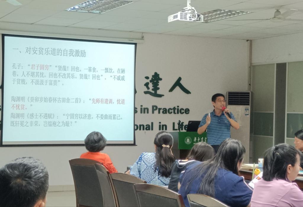 “先师有遗训,忧道不忧贫。”以孔子与陶渊明之见为伊始,胡守强书记指出,身为人民教师,更要坚定自己的理想信念,保持乐于学习的积极态度,时刻牢记党和人民的嘱托,“勿慕贵与富,勿忧贫与贱”,涵养正气,提高觉悟,清白自守,脂膏不润。