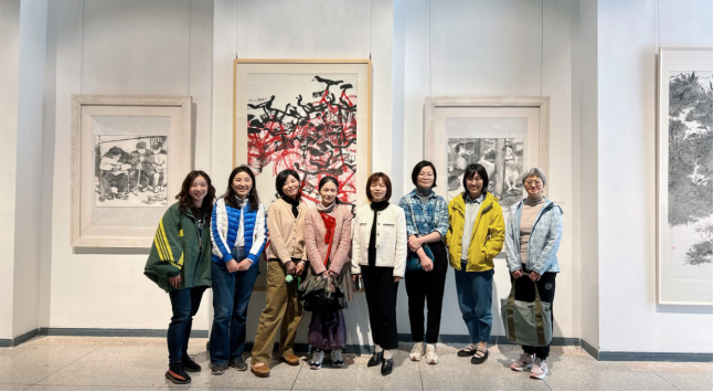 会后,党员教师来到艺术馆,参观“水墨大方”书画艺术展,老师们在欣赏画作的过程中感叹中华文化深厚的历史底蕴,画作将传统文化与现代艺术相交融,不仅展现了传统的水墨艺术,也在画中融汇了灵动、清晰的现代性审美。