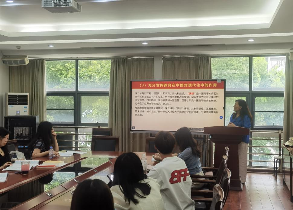 公外教工第二党支部江凯同志对习近平总书记在二十届中共中央政治局第五次集体学习中强调的教育强国理念进行了解读。他从建军25周年运动会时的“识字赛跑比赛”引入,绘声绘色地讲述了建国初期至今中国从扫盲运动、推动基础教育再到大力发展高等教育的辉煌成就。他指出,强国必先强师,夯实教育强国之基,需坚持把高质量发展作为教育的生命线,努力加强教师队伍建设。