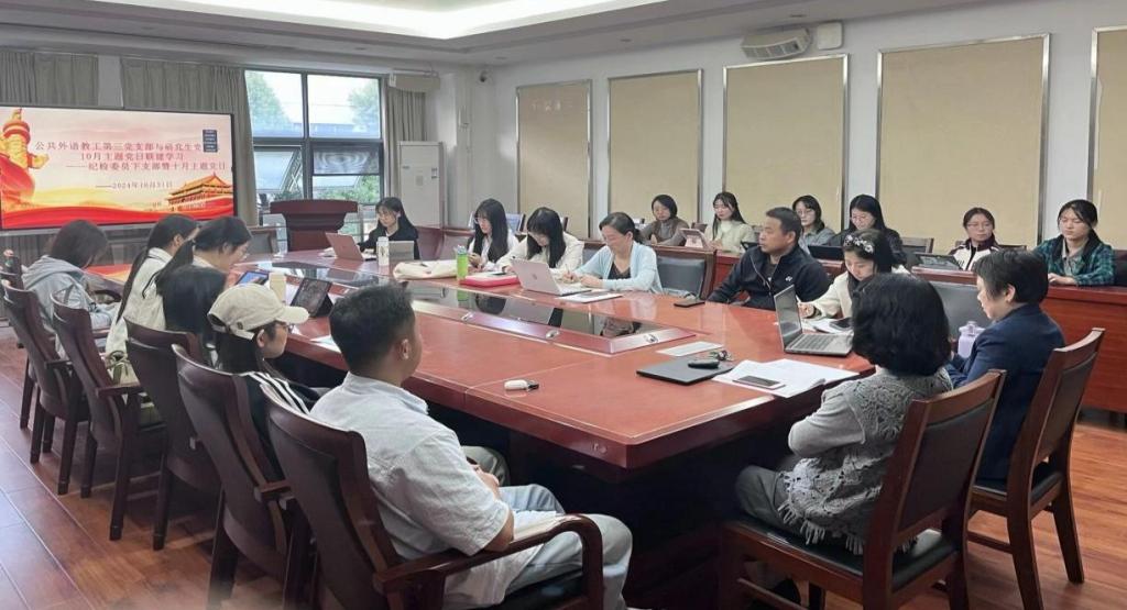 10月31日下午,公共外语教工第三党支部与研究生党支部齐聚人文楼M327会议室开展十月主题党日共建活动,围绕习总书记《论教育》专题文集的选文、习总书记在国家勋章和国家荣誉称号颁授仪式上的讲话和《中国共产党纪律处分条例》进行集中学习。研究生支部书记王艳芳主持会议。