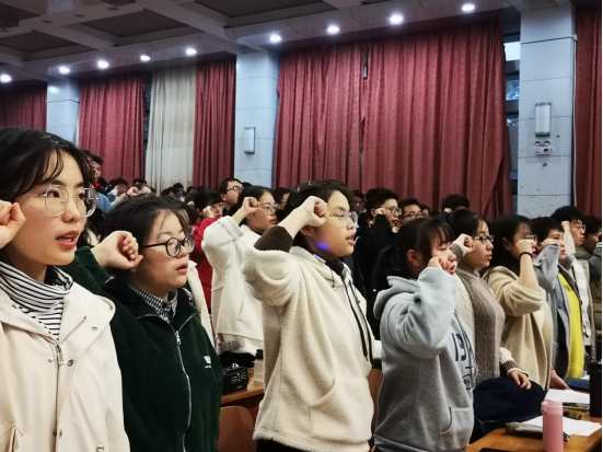 最后,田昌聪带领全体新生重温入团誓词。一声声铿锵有力的宣誓词仿佛提醒着同学们要时刻牢记入团的初心,同时牢记华农的校训:勤读立耕,立己达人,紧跟时代步伐,不断向前,不断精进,争做四好青年。