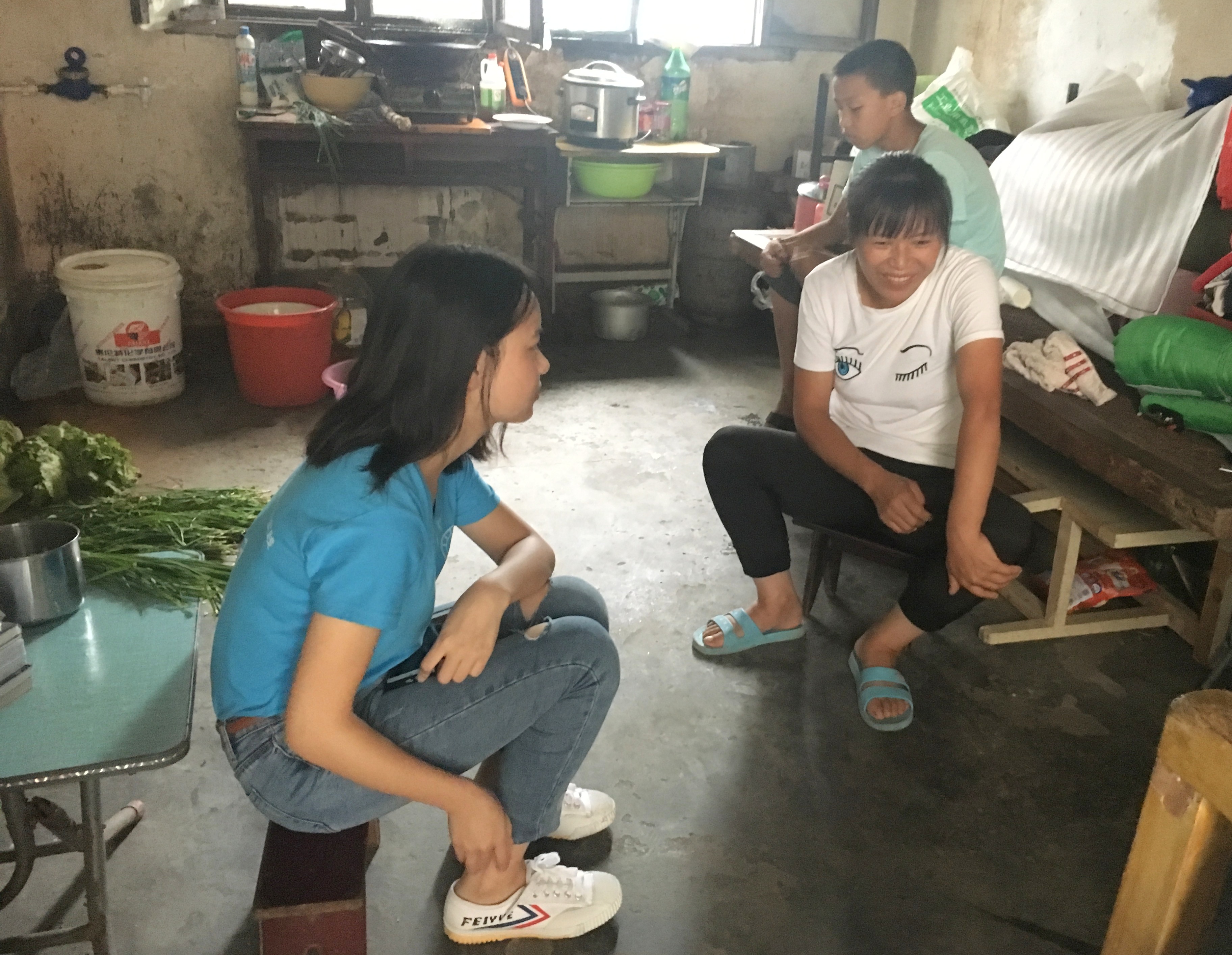 简陋的一间小房子里摆着床、桌子、锅碗瓢盆等,室内光线昏暗,这是郭雄家给队员的第一印象。放下带来的东西,梁阿姨十分热情地招呼大家坐下。她说:“真的是很辛苦你们了,暑假没有出去玩,还来这里给我们孩子提供志愿服务,传授知识,真的是太好了。”谈话过程中,队员了解到郭雄爸爸去年因癌症去世,梁阿姨不仅要照顾孩子,还要照顾郭雄年迈的奶奶。虽然目前家中的状况不是很好,但梁阿姨却非常积极乐观。说话时,梁阿姨一直笑着,还跟队员聊起了以前的小学的状况。据了解,郭雄有一个上大学的姐姐,见家中只有梁阿姨母子二人,队员便问起了郭雄姐姐的事情。梁阿姨表示,郭雄姐姐在市里上师范学校,暑假在外打工以帮自己减轻负担。有了一个上大学的姐姐,郭雄多多少少也能受其影响。郭雄平常虽然调皮,喜欢和其他男孩打闹,但他非常喜欢上学,也很听老师的话。对于课后作业,郭雄一般在学校里做完,有时候会拿回家做,保证完成老师布置的任务。梁阿姨说郭雄的字写得不好看,盛锦悦便在家访结束前叮嘱他一定要把字练好,这对以后的影响还是比较大的。