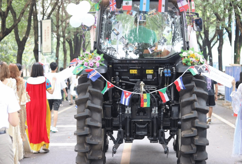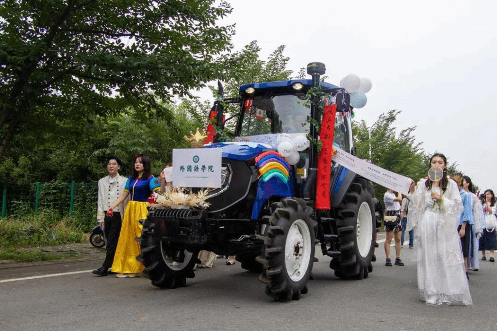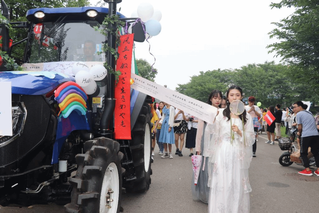 在此次巡游活动中,我院毕业生以“汇通中外,语播华夏”为主题,对11号农机车进行了精心装饰,充分展示出我院的学科特色及对毕业生的美好祝福。学院党委书记胡守强,副院长覃江华、方红,教师代表与毕业生一起共同参加欢庆活动。