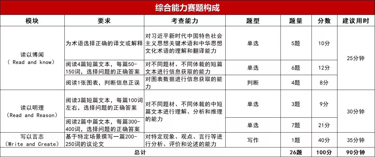 比赛内容涵盖英语综合能力,包括阅读、翻译和写作三个模块,具体比赛规则和题型请参考以下相关说明。