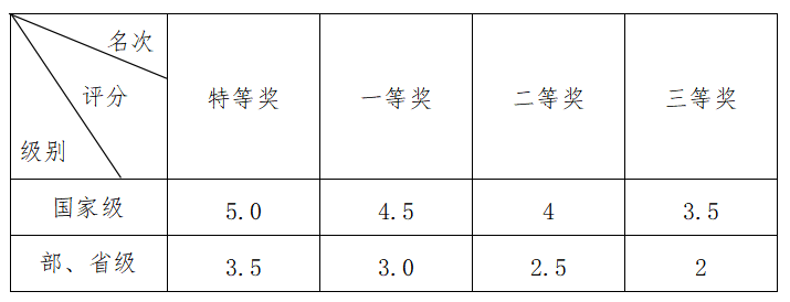 评分依据比赛级别和获奖名次计分;若是团队获奖,对排名前5的成员(本院)进行加分,按团队赛事级别和名次对应总分的0.5/0.4/0.3/0.2/0.1的系数赋分;比赛若设金奖、银奖和铜奖,奖励分对应分值为:金奖对应特等奖的分值,银奖对应一等奖和二等奖的平均分值,铜奖对应三等奖的分值。详见下表: