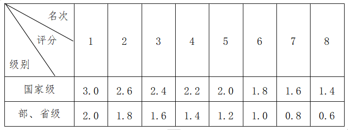 评分依据比赛级别和获奖名次计分;比赛若设一、二、三等奖和优秀奖,奖励分对应分值为:一等奖对应第1名的分值,二等奖对应第2、3名的平均分值,三等奖对应第4、5、6名的平均分值,优秀奖对应第7、8名的平均分值;比赛若只设优秀奖,优秀奖奖励分的对应分值为1-8名的平均分值。若比赛奖项设置有“特等奖”,则“特等奖”相当于“一等奖”,一等奖相当于“二等奖”,依次类推。详见下表: