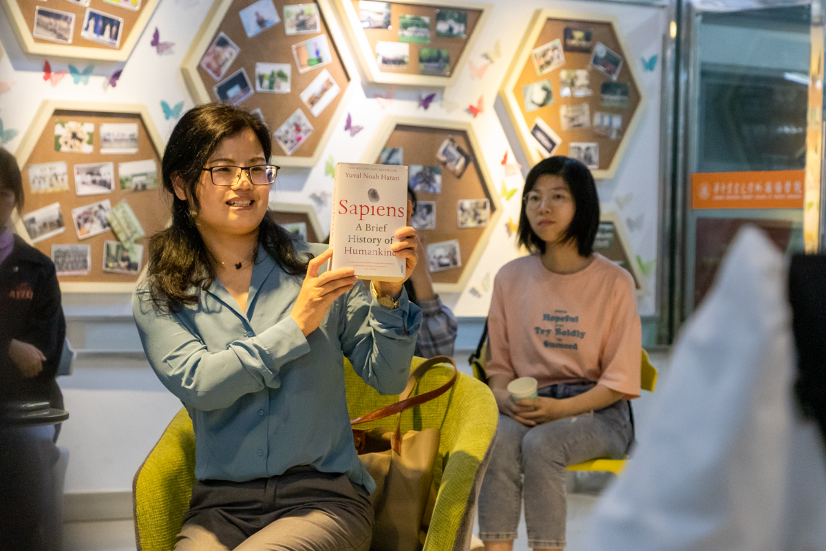 大家各色座椅以主持人所在的圆桌为中心围成圆圈,琳琅满目的书籍躺在书架上,悠扬轻快的音乐游走,吧台提供自助饮料,柔和的暖黄色灯光照耀……独具一格的活动场景布置拉近了大家的心理距离。王菲老师率先分享了自己的阅读心得并向大家推荐了《人类简史》一书,她谈到,阅读为我们提供了体验“窗子以外”的生活的机会,也能够帮助我们感受生活中的点滴温柔和美好,这正是我们相聚在此的原因。随后,同学们三五成群,用英文互相交流着最近的阅读书目和体会。有些谈论着阅读英文原版书籍的方法,建议大家当遇到生词过多的问题时,可以采用调整阅读节奏、参考中文译本等方式来辅助,另一些同学谈到了电子书与纸质书的偏好问题,大家从便利性与阅读效果出发,纷纷表达了自己的观点。此外,在谈及原版书籍和改编影视作品时,大家普遍支持优秀的影视改编作品是对原著的宣传和升华,通过影视中展示的多方面细节,能够更好地帮助观者理解剧情,也能使得剧情更加紧凑、冲突更加强烈。