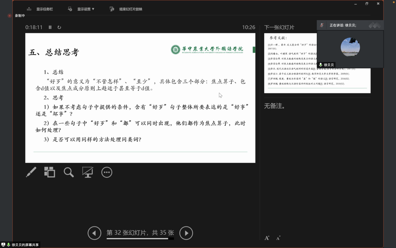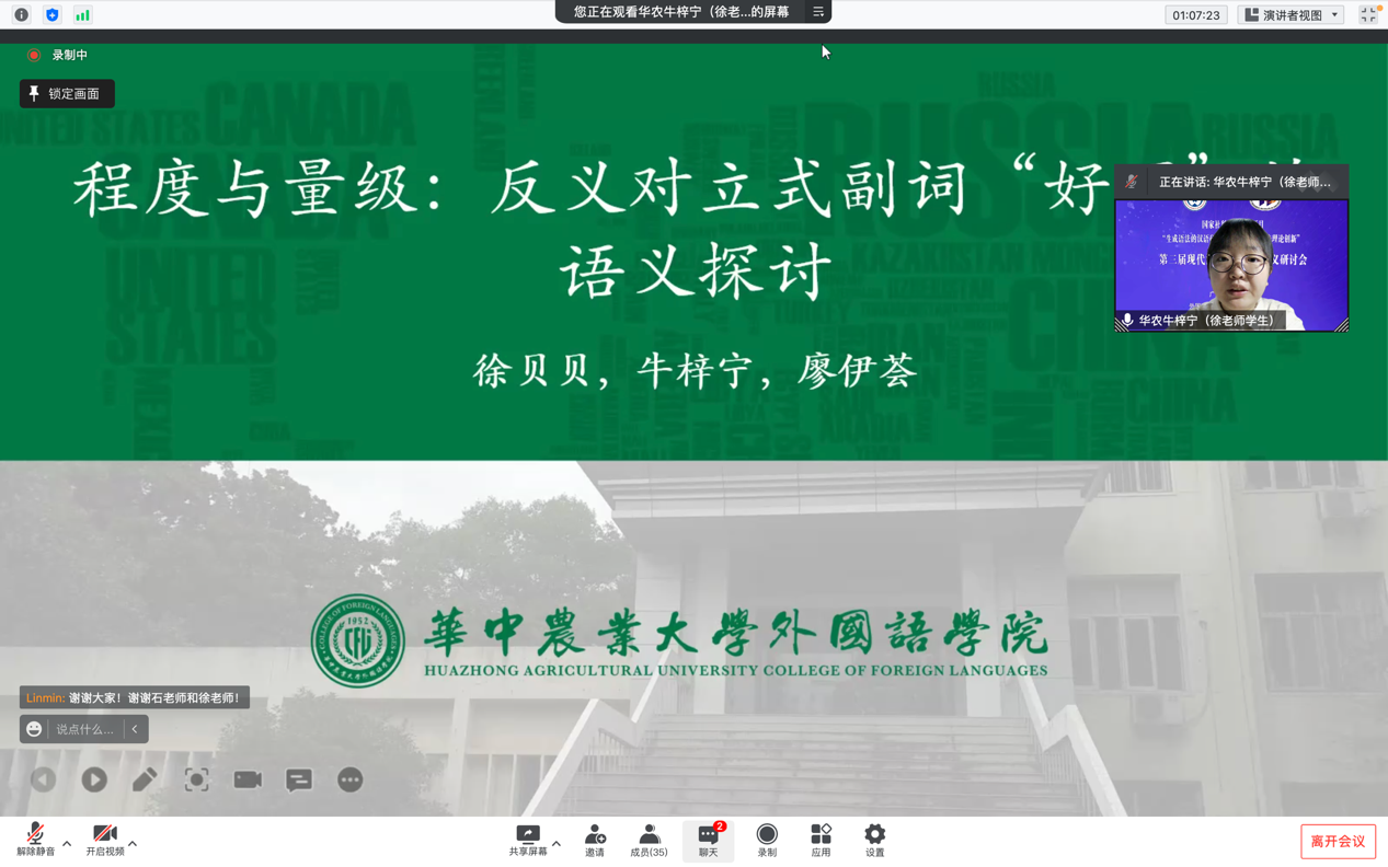 4月17日上午,我院师生在会上做了名为“程度与量级:反义对立式副词‘好歹’的语义探讨”的汇报发言。整个发言分引言、前人研究、分析过程、语料解释和总结思考五个部分,前两部分由牛梓宁负责汇报,后三部分由徐贝贝负责汇报。报告时间一共50分钟。