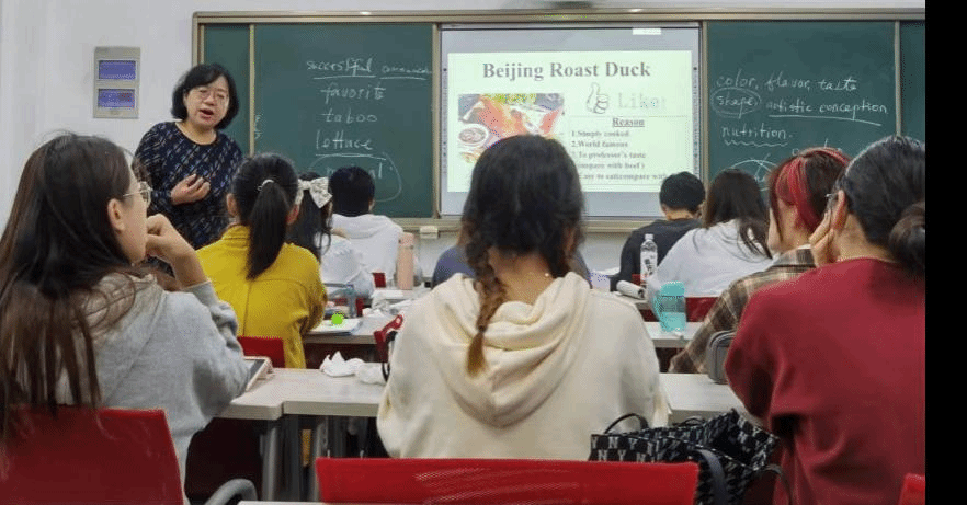课程主题是饮食文化(Cuisine Culture)。师生围绕中外饮食文化展开讨论,从汉语中涉及饮食文化的日常表达到中国菜名的英文翻译,从食物在中西文化中的不同地位、功能到中西方饮食习惯差异,从餐桌文化到食物烹饪方法等方面。
