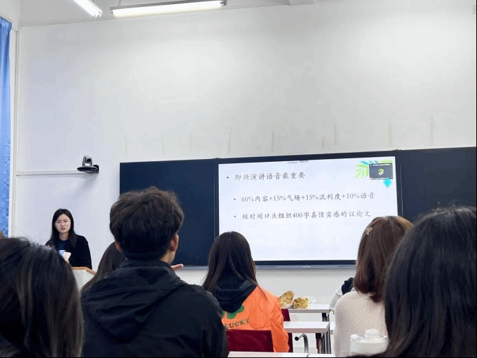 最后,张陈辰总结道,想要练好演讲,平时就要加强输入,雅思听力、TED演讲的文稿都是很好的材料,需要对部分语段进行背诵;输出方面,要进行跟读、仿读练习,学习发音技巧,增强表达能力。此外,演讲效果也是很重要的,自信的姿态和自然的动作是制胜的关键。