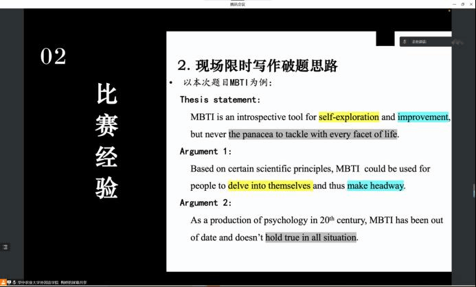 接着,陈心愿作为本届“外研社·国才杯”英语阅读大赛湖北省一等奖的获得者,和同学们交流了她在赛前的准备经验和赛后的复盘反思。她以自己的参赛经历为例,说明日常的学习就是一个长期备赛的过程,比赛中考察的一些知识点常常会与平日所学相契合,所以将课程知识灵活运用到考试中是非常重要的。对于赛前,她强调要利用样题进行大量的模拟训练,以此熟悉比赛题型和每个板块的分值,确定自己的做题顺序和风格。对于参赛时,她提醒同学们要准备一张白纸和笔,把不确定的题目和选项在纸上做好标记,方便检查和复盘。对于赛后,她希望同学们能积极反思比赛时的所得与所失,并介绍了一些复盘技巧。由于大赛阅读题的材料覆盖面广,熟悉文章的话题便变得尤为重要,所以同学们需要在课外拓宽自己的阅读面,开阔视野。同时,保持良好的参赛心态也十分重要。