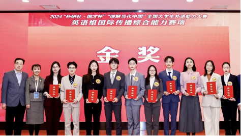 今年大赛全面提升了考查标准,将阅读、写作与演讲赛项整合为国际传播综合能力赛项,着重考察选手的国际传播实战能力,旨在培养符合全球传播需求的高水平外语人才。赛题涵盖习近平新时代中国特色社会主义思想的核心内容,涉及前沿技术应用、汉服文化海外传播和全球环境治理中的中国方案等多个主题,鼓励选手理解当代中国,拓展国际视野,促进文明交流互鉴。最终,袁炜轩同学摘得国赛金奖,徐臻宇与王潇悦同学荣获国赛银奖,郁贺同学获得国赛铜奖。