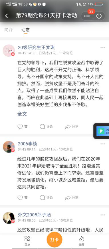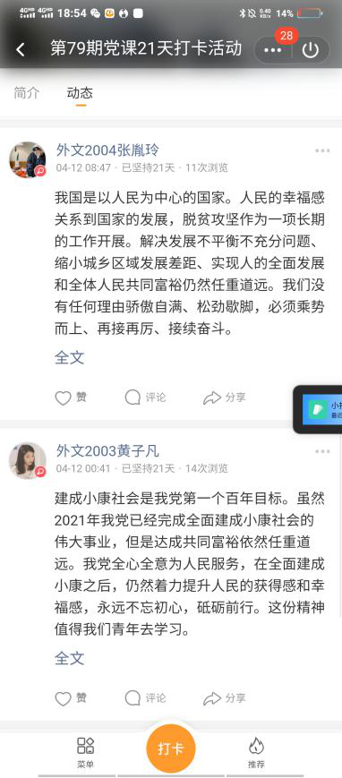 4月11日关于“习近平论教育引导全党以史为镜,以史明志”的打卡中,外文2006班杨睿琳谈起了学习党史对于中国共产党发展的作用:“百年风雨,百年辉煌。从‘小小红船’到‘巍巍巨轮’,我们党创造了非凡业绩。历史是最好的教科书。对共产党人来说,中国革命历史是最好的营养。从一个世纪的风云变幻中,中国共产党勇担历史重任,在探索中奋斗,在开拓中前进,推动中国发生了翻天覆地的变化”。