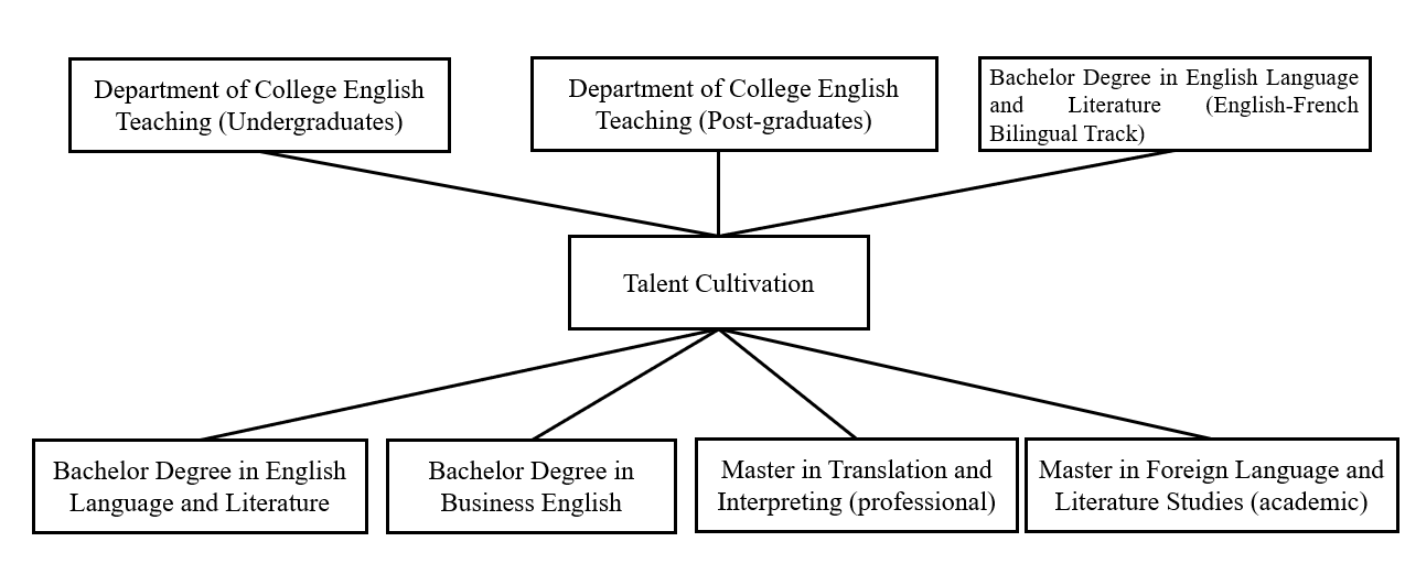 Talent-Cultivation Reforms. Department of College Foreign Languages Teaching adopts a run-through cultivation method featuring “General English + Academic English”, “theory + practice” and “language + culture + academic literacy”. Department of English Language and Literature Studies, awarded with second prize in provincial teaching award, provides training in integrated language skills, intercultural communicative competence, and high-order thinking skills. Department of Business English follows a principle of “Business+English+Competence+Practice” for talent cultivation. Starting from 2021, a new double bachelor degree program in English and French is offered.